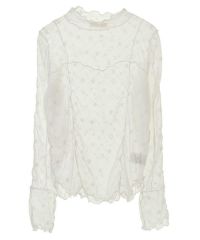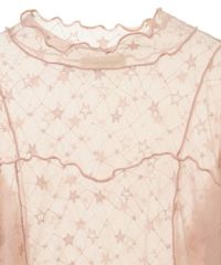 伸縮性のある星柄のストレッチチュールを使用したシースルートップス。 スタイリッシュなハイネックデザイン。 身頃のランジェリーライクなメロー切り替えで女性らしさをプラス。 程よくタイトなシルエットで1枚ではもちろん、レイヤードアイテムとしても最適。 春のアクセントカラーに最適なピンク、 ジャンルレスで活躍するオフホワイト・ブラックの3色をご用意。 スタイリングに一捻り加えたい時にぴったりです。