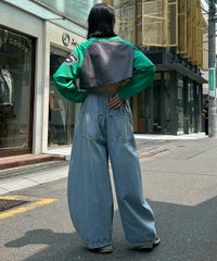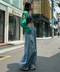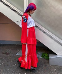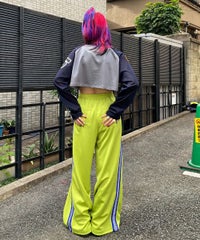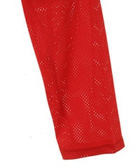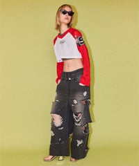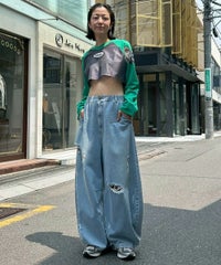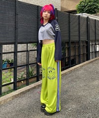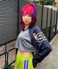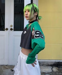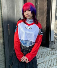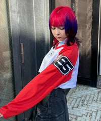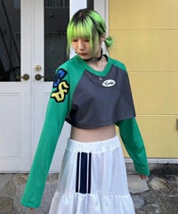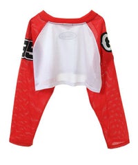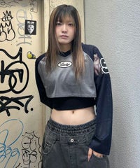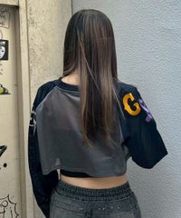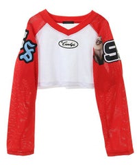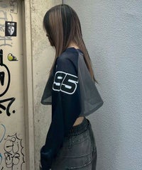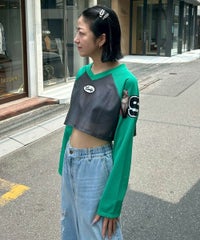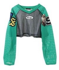 網目の異なる2種類のメッシュを使用したショート丈のトップス。 フロントにはロゴワッペン、左右の袖には転写プリントとアップリケを贅沢に盛り込みました。 カジュアルにもスポーティにも使える万能アイテムです。