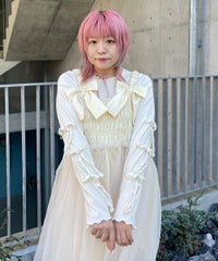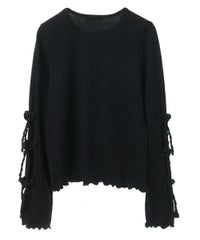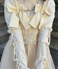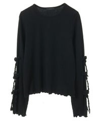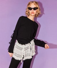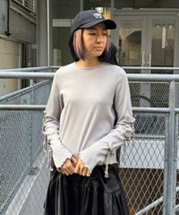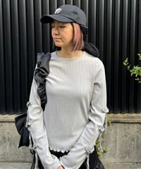 適度な肉感で1枚で着用しやすい、しなやかな肌触りのT/Rテレコ素材を使用したトップス。 両袖のリボンディティールでアクセントをプラスしています。 1枚ではもちろん、ワンピース等のインナーにも最適。 同じ素材・ディティールを使用したフレアパンツを組み合わせていただくのもオススメ。 スタイリングに取り入れやすい、アイボリー・グレー・ブラックの3色展開。 1枚あると活躍する万能アイテムです。