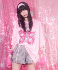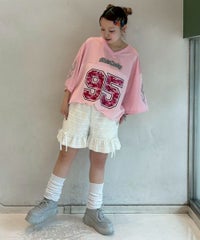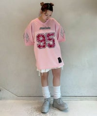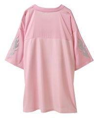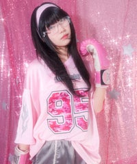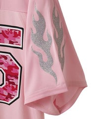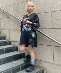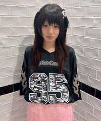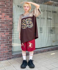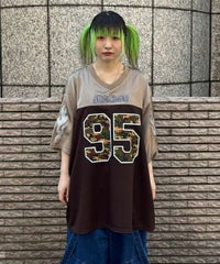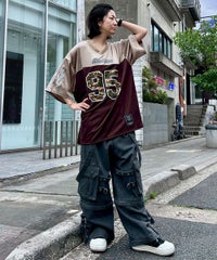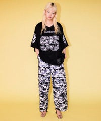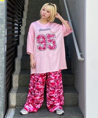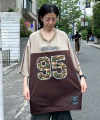 マイクロメッシュとサテンを組み合わせたナンバリングトップス。 カモフラージュ柄に溶け込んだオリジナルキャラクターの「PEPE」にもご注目。 両袖のシャイニーに仕上げたファイヤーパターンでアクセントをプラス。 オーバーシルエットなサイズ感で、ワイドパンツやハーフパンツと相性◎ ナンバリング部分のカモフラージュ柄と同じ配色のカーゴパンツを 組み合わせた着こなしもオススメです。 1枚でトレンド感のある着こなしをお楽しみいただけます。