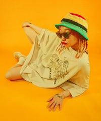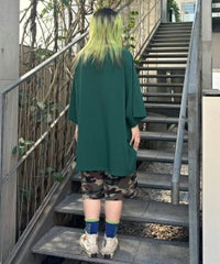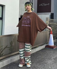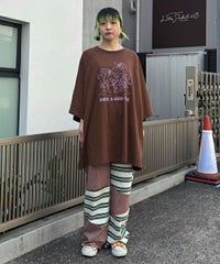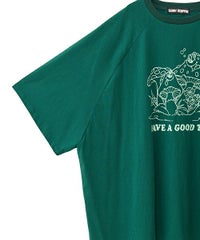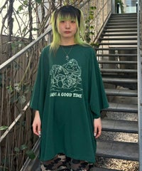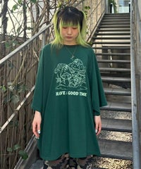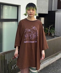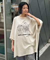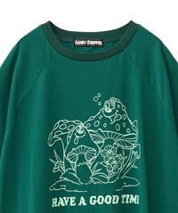 アメコミタッチのマッシュルームモチーフがキュートなラグラントップス。 程よい肉感と軽やかさのある20/-天竺を使用しており着心地も◎ オーバシルエットなサイズ感でユニセックスでご着用いただけます。 トップスとしてはもちろん、1枚でワンピース風の着こなしもオススメ。 ストリートスタイルにぴったりなアイテムです。