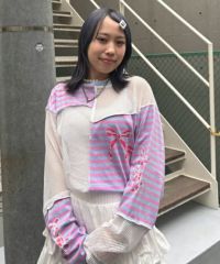 メッシュ素材とボーダーのカットソー素材を組み合わせたトップス。 切り替え部分のパンキッシュなディティール使いもポイント。 ランダムにあしらったアニマルモチーフやリボン・ロゴのグラフィックで キャンディらしい遊び心をプラスしました。 程よい透け感が楽しめる夏らしい1枚です。