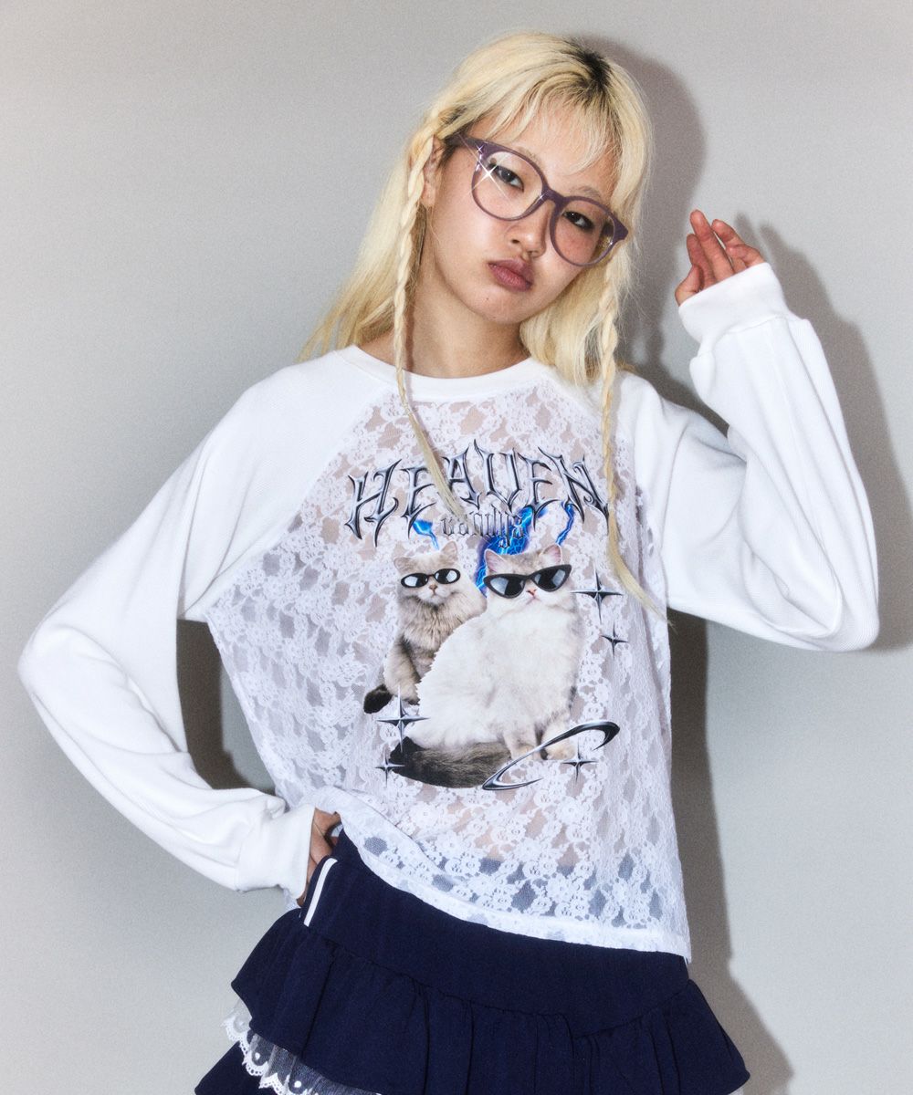 バンドT風の強めグラフィックをあえてレース生地にプリントしました。