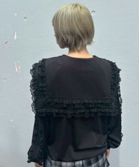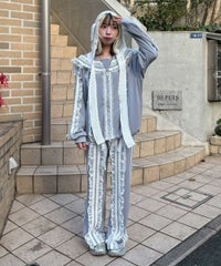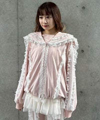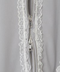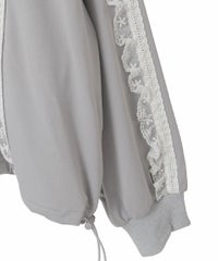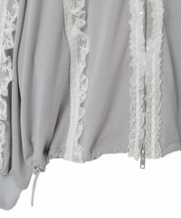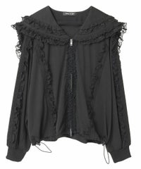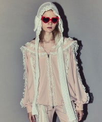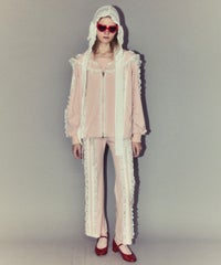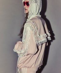 シグネチャーディティールである「セーラーカラー」を デザインに落とし込んだトラックジャケット。 コットンレースとチュールレースを随所にあしらい デコラティブに仕上げました。 程よい肉感のエステルポンチを使用し軽やかな着心地。 袖口はホールド感の強いリブ仕様で機能性も◎ 取り外し可能な胸当てや、両開きファスナー、 裾のスピンドルなどシーンや着こなしに合わせて調節可能。 同シリーズのトラックパンツを組み合わせた着こなしもオススメ。 トップスとしてはもちろん、軽めの羽織りにも最適です。 ・ ・・・・・・・・・ ・・・・・・・・ ・透け感:なし ・伸縮性:あり ・生地の厚さ:やや薄手 ・裏地:なし ・ ・・・・・・・・・ ・・・・・・・・