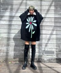 手描きのフラワーモチーフをジャガード編みで表現したニットトップス。 程よくしっかりとした厚みのコットンアクリルのニット。 ふっくら柔らかく、着心地の良い快適な素材です。 ゆったりとしたオーバーサイズなシルエットで、1枚でワンピースとしても、ボトムを組み合わせてトップスとしても、お好みで着用していただけます。