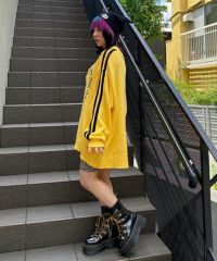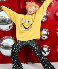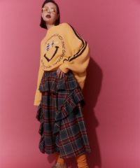 ローゲージでざっくりとした風合いに仕上げたスマイルモチーフのニットトップス。 肩~袖のライン使い・ポップなカラーリングがポイント。 程よいオーバーシルエットでスカートにもパンツにも相性が良いサイズ感に仕上げています。 着丈に前後差を付けることでスタイルアップ効果も◎ コーディネートのアクセントに最適なアイテムです。
