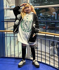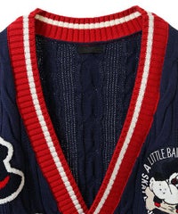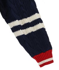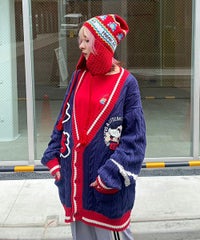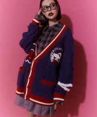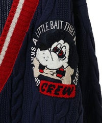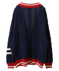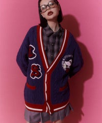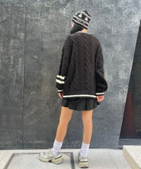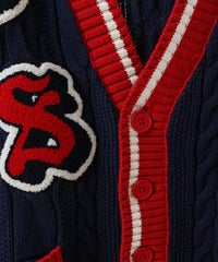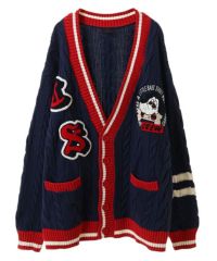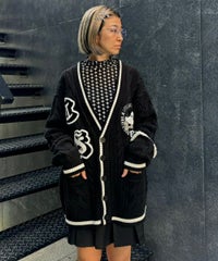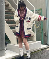 コットン・アクリルの混紡ニット素材を使用したカレッジテイストなVネックカーディガン。 ケーブル編みのアラン模様を施し、温かみのあるニットカーディガンに仕上げました。 サガラ刺繍で表現したCSロゴと骨に見立てたスケボーを咥えたドッグモチーフがポイント。 襟・裾・袖口・ポケット・ラインを配色にし、アクセントに。 オーバーシルエットでユニセックスな雰囲気に仕上げています。 程よいボリューム感で、カーディガンとしてはもちろん季節の変わり目のアウターとしても活躍します。 ストリートなスタイリングにぴったりなアイテムです。