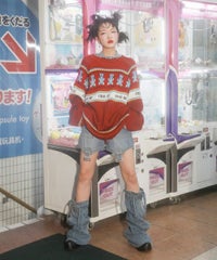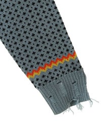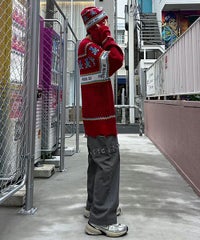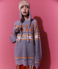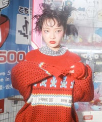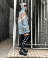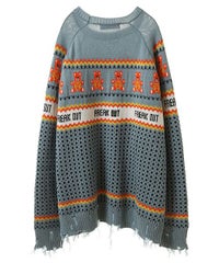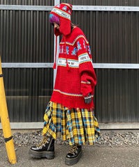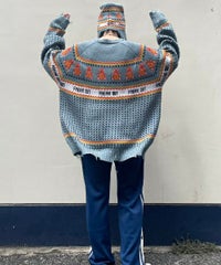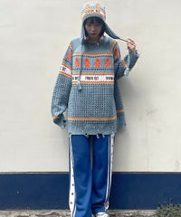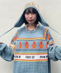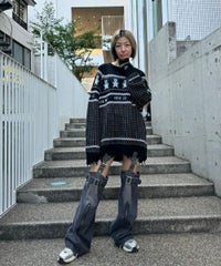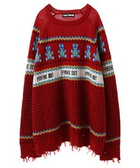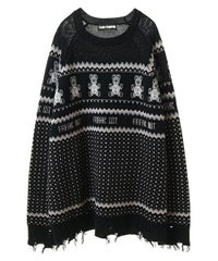 パンキッシュなモチーフを取り入れたノルディックニット。 袖と裾に施したダメージ加工もポイント。 オーバーシルエットに仕上げているので1枚でワンピース風の着こなしはもちろん、 組み合わせるボトム次第でパンク~ストリートまで様々な表情をお楽しみいただけます。 ポップなカラーリングで主役級にキマる1枚です。