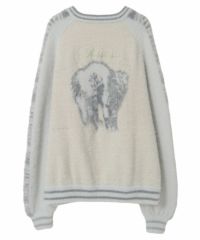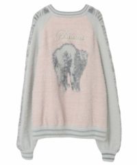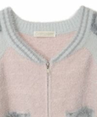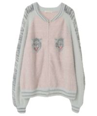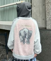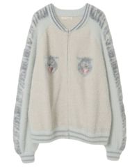 ふわふわと毛足のある糸を全体に使用した、スカジャン型のニットカーディガン。