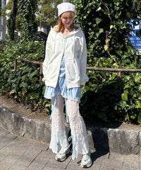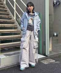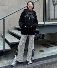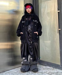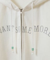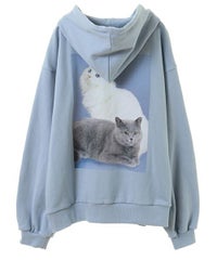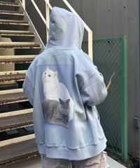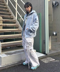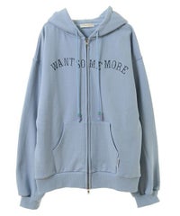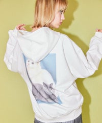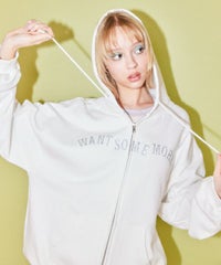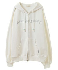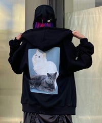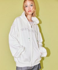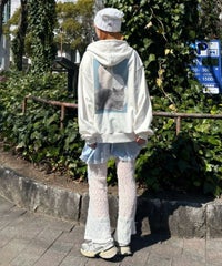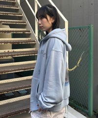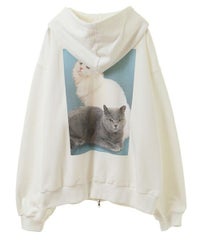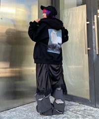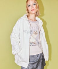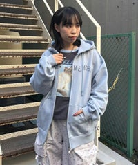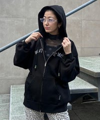 フロントのグリッターロゴ、バックの大きなフォトプリントが目を惹くフーディー。 スピンドルに付けたビーズでアクセントもプラス。 程よい肉感の裏毛素材を使用しておりシーズンレスでご着用いただけます。 ファスナー部分は両開きで、着こなしに合わせて調整可能。 程よいオーバーシルエットで腰回りをカバーできるのも嬉しいポイント。
