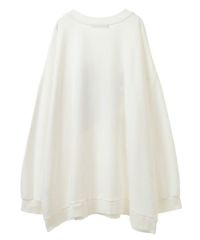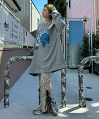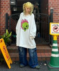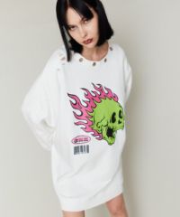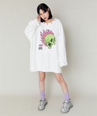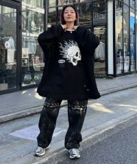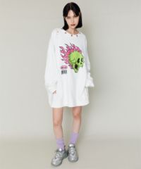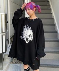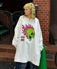 スカルモチーフを染み込みプリントでプリントしたオーバーシルエットのトップス。 衿リブに付けた大きめのハトメやダメージ加工など パンキッシュなディティール使いもポイント。 薄手の裏毛素材を使用しており軽やかな着心地も◎ トップスとしてはもちろん、低身長な方は1枚でワンピース風に着こなしていただくこともオススメ。