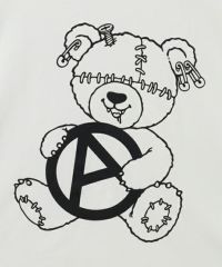 アナーキーマークをハグしているパンキッシュなくまのぬいぐるみのグラフィックのBIG Tシャツ ●26/-天竺生地を使用したオリジナルボディ ●やわらかいコットン100%の生地を使用し着心地も抜群 ●ヒップラインも隠れる安心感のある丈 ●様々な着こなしに対応できる適度なビッグシルエット ●ユニセックスで着こなしが楽しめるデザイン