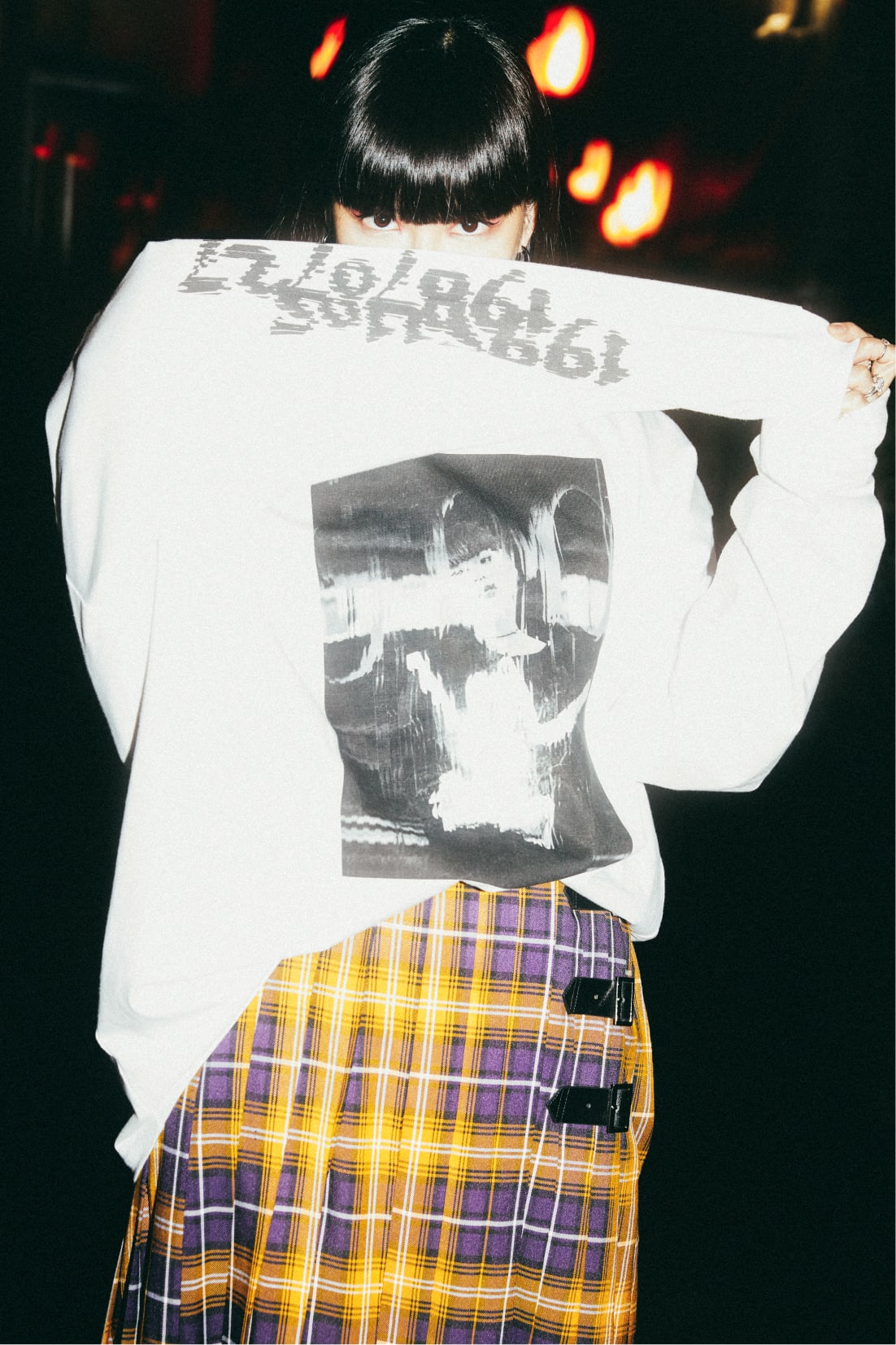 ファンの皆さんのために。照ロンT は2型4種類作りました。友達のグラフィックデザイナーの河村康輔さんに、Candy Stripperの撮影で撮った私の写真をコラージュしてもらったデザイン。袖には、Candy Stripperと私、河村康輔さんの名前が入っていて、Candy Stripperが創設した年と私の生年月日が重なってる。ロンTの形もオリジナルで作ったので、Candy StripperのいつものロンTよりダルッとしていて、袖も長いし、ユニセックス感がある。そのまま着てもいいけど、上からTシャツを着て、袖だけ見せたり、アームウォーマーのようにくしゅくしゅにして着てもいいんじゃないかな。私は自分の顔がプリントされていて着るのは恥ずかしいので…(笑)。