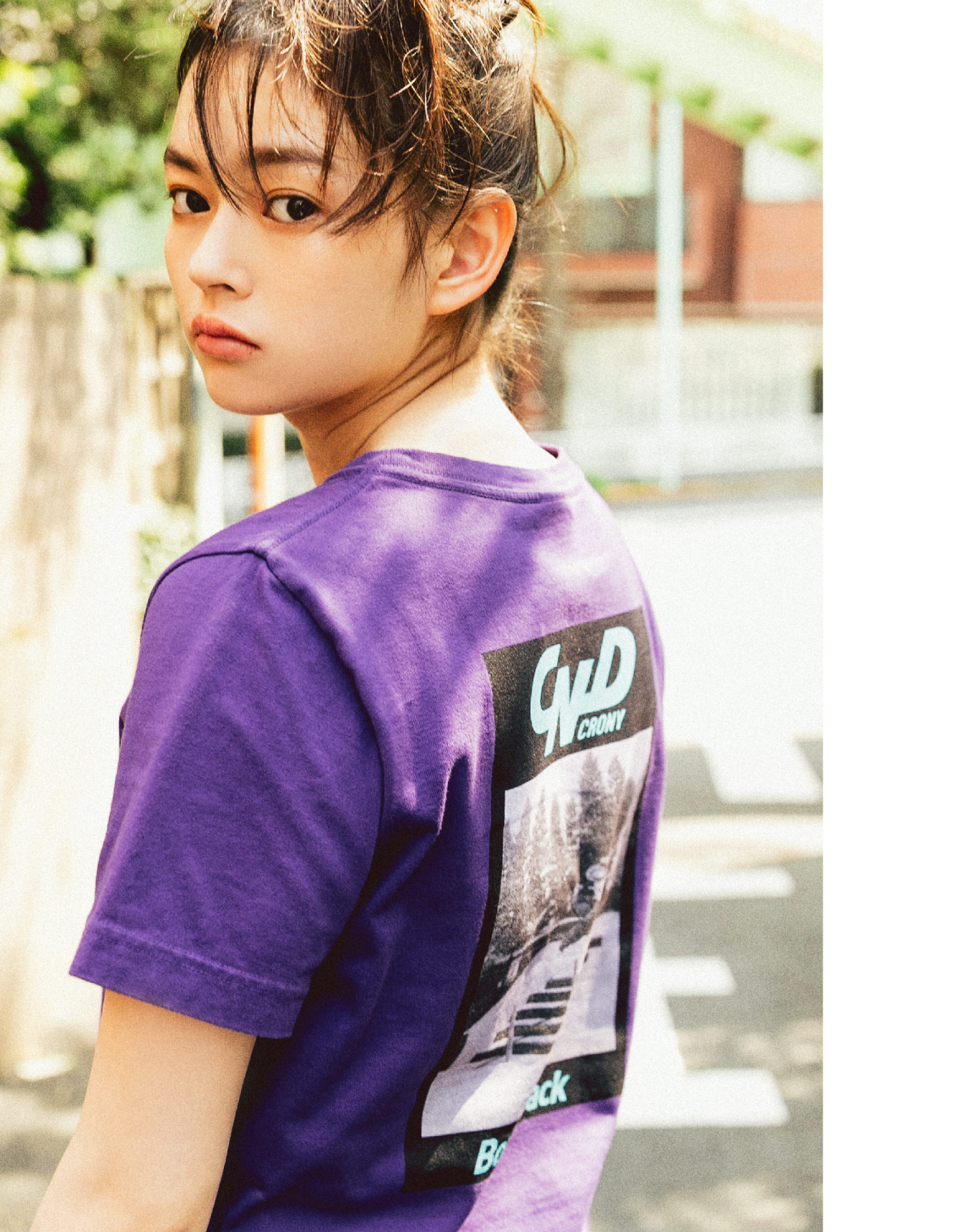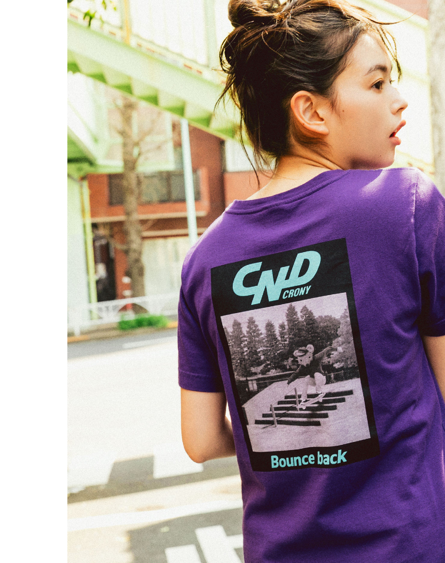 フロントはシンプルだからこそ、バックスタイルに存在感を持たせたい。着ぐるみを被ったスケーターのグラフィック×ロゴプリントがインパクト大。濃いパープルのボディが良さを引き立てます。