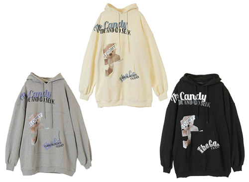 ランダムにプリントされたロゴやクマのグラフィックがポイント。