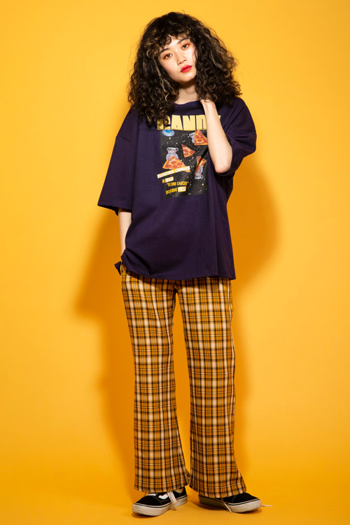 脚長効果を期待できるフレアシルエットが特徴のチェックパンツ。