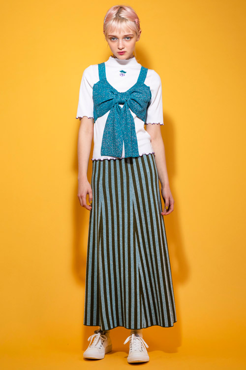 ラメニットを使用した程よいフレア感のロングスカート。