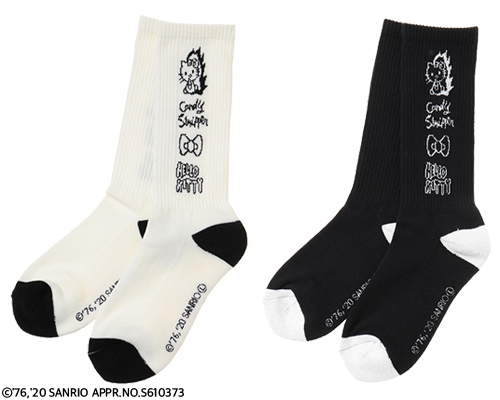 手描きタッチのキティや落書き風ロゴが可愛いクルー丈のリブソックス。