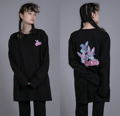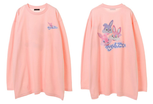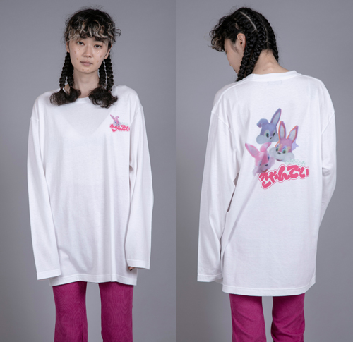 ファニーなひらがなロゴとうさぎのぬいぐるみをプリントしたロンT。