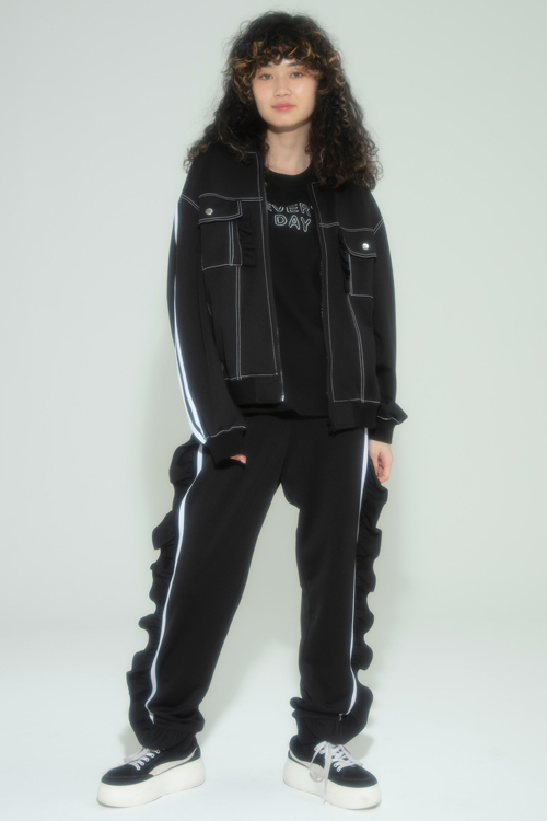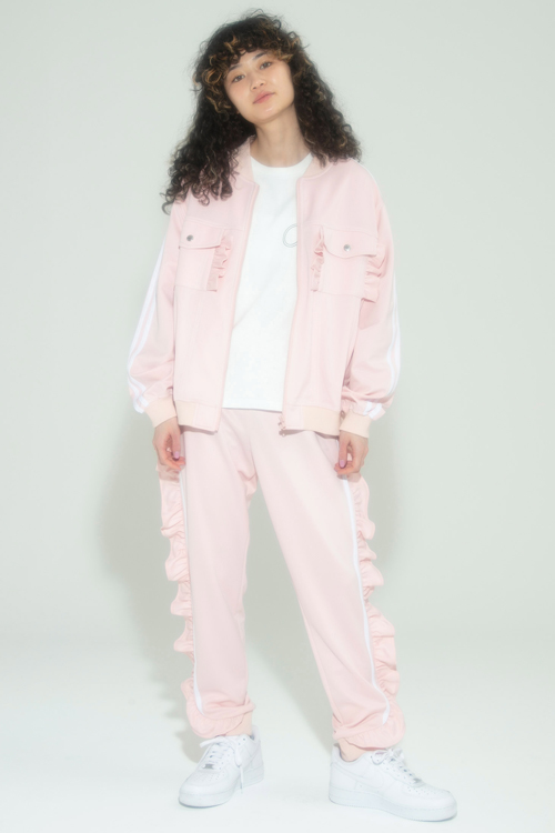 サイドにフリルを施した、ガーリーな雰囲気漂うジャージパンツ。