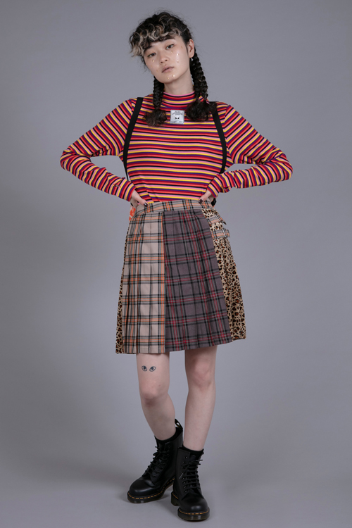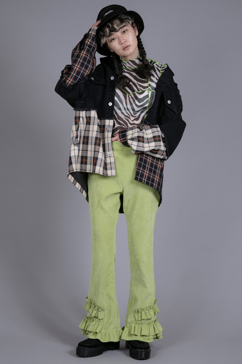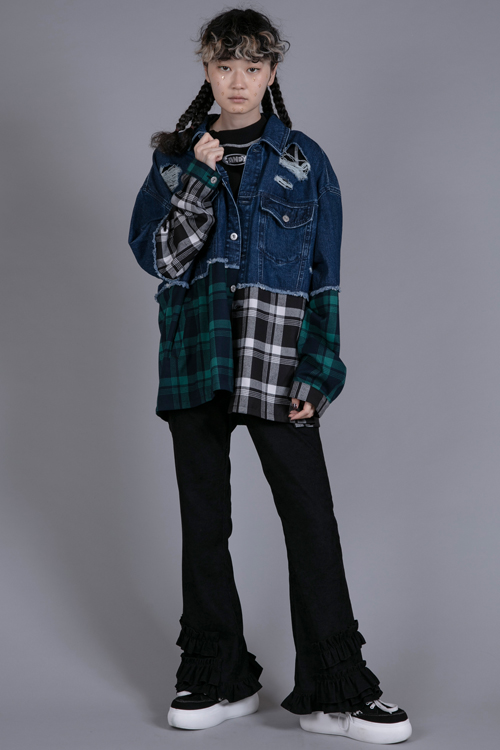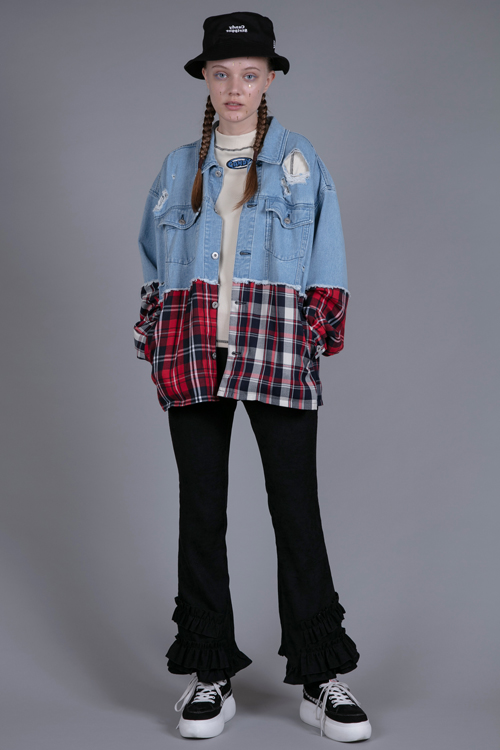 チェック素材をドッキングさせたリメイク風ジャケット。