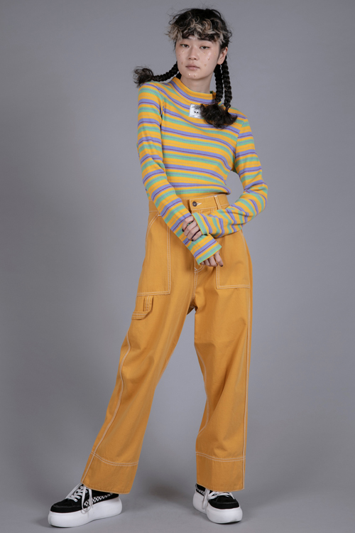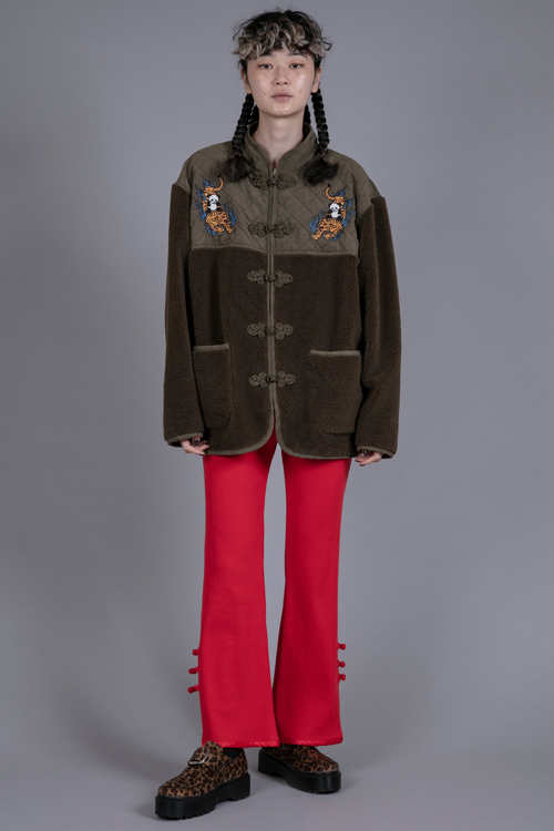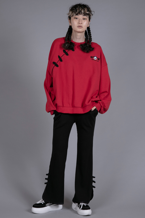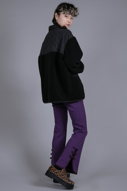 チャイナボタンやパイピングがポイントのリブパンツ。