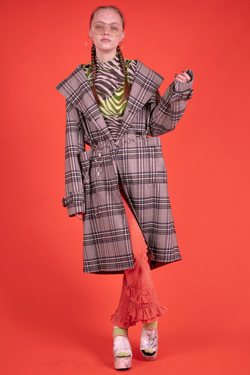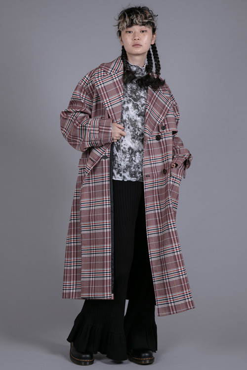 チェック柄ロングコート。