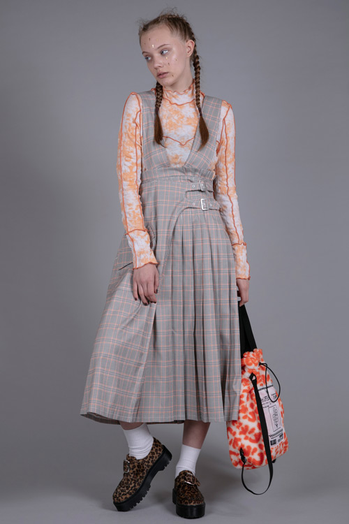 取り外しの出来るサスペンダー付きのラッププリーツスカート。