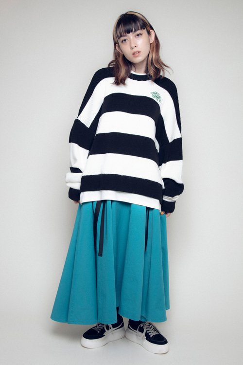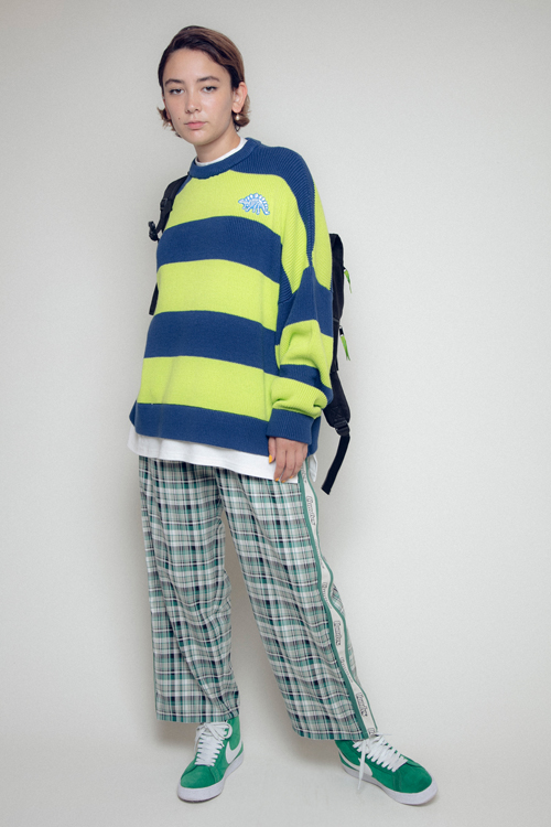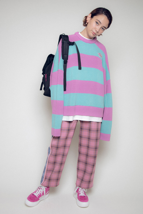 ニットの下にロンTをレイヤードしているデザインも特徴。
