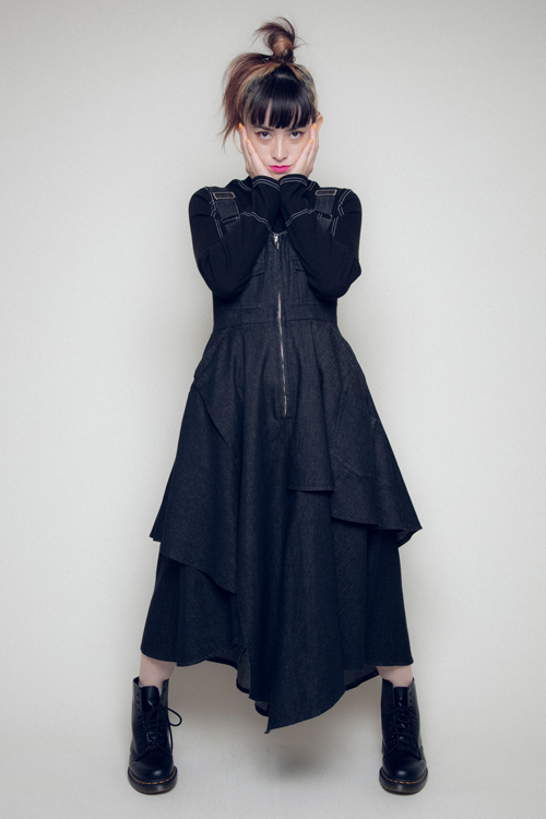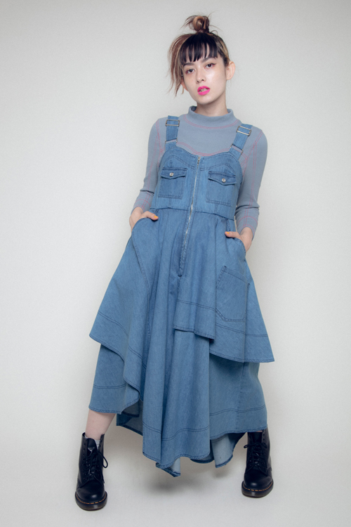 何重にも重ね合わせたデニムの切り替えが目を引く一着。