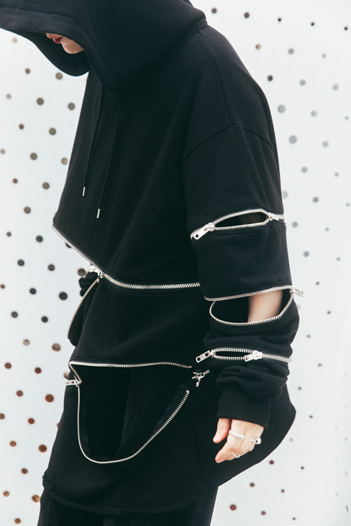随所に施したZIPがポイントのフーディ。