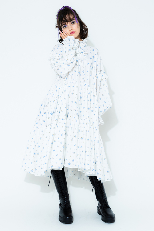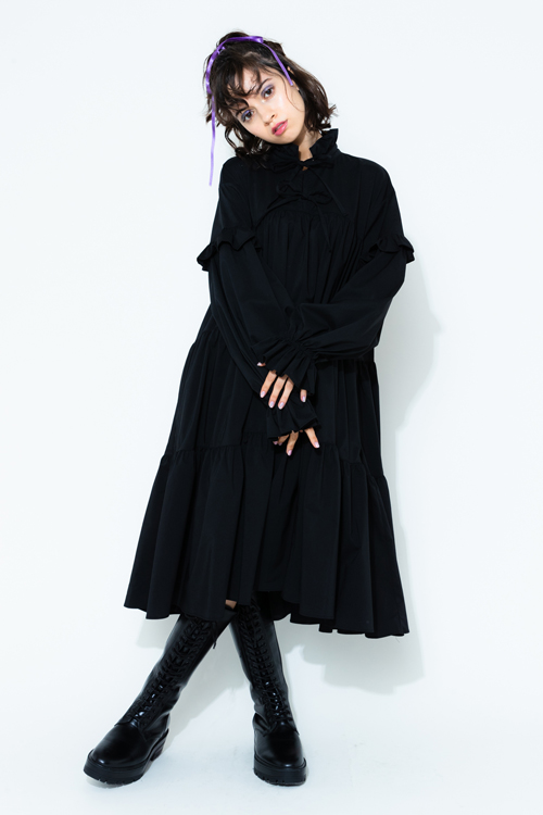 フリルのスタンドカラーやボリュームスリーブなど