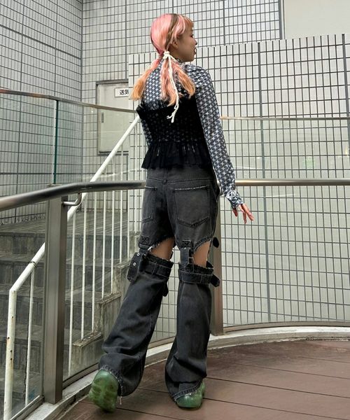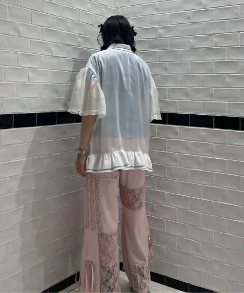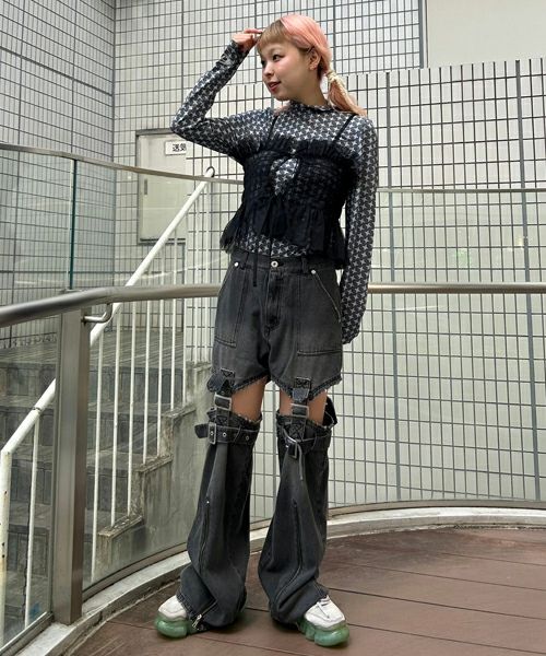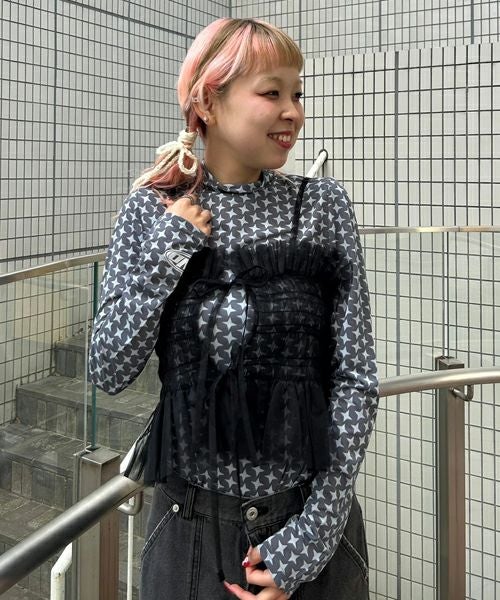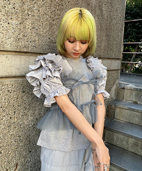 CUT SLEEVE MESH PATCHED TOPS